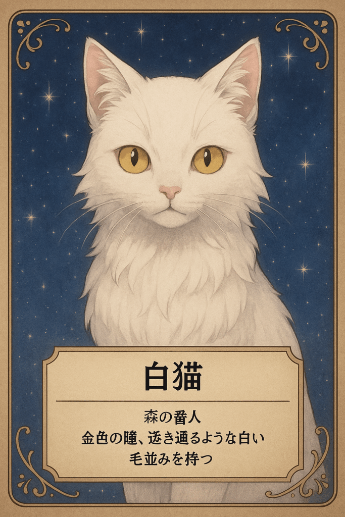 外見: 金色の瞳、透き通るような白い毛並みを持つ不思議な猫。